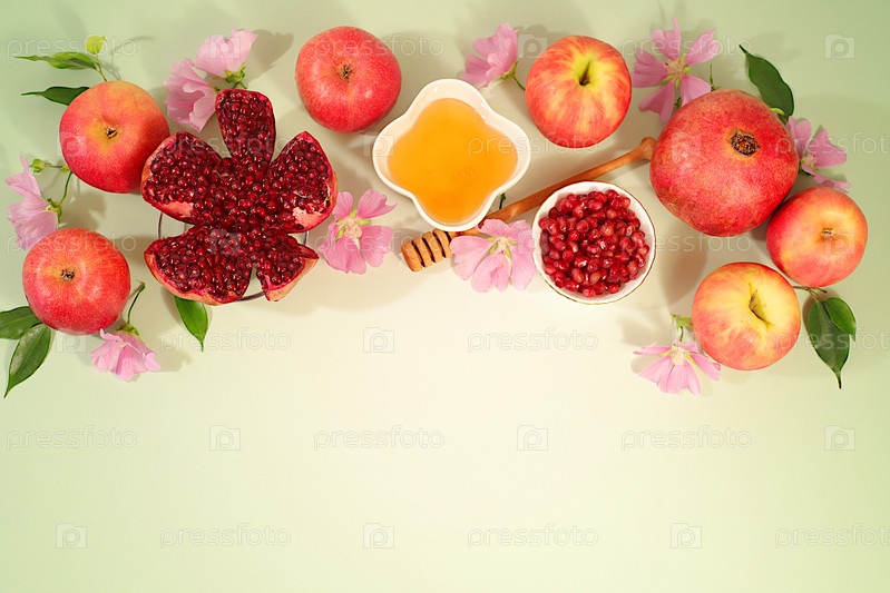 Творческая композиция на еврейский праздник Рох Хашан с местом для поздравлений. стилирование традиционными символами Еврейского Нового года, шаблон с медом, яблоками, гранатом и цветами