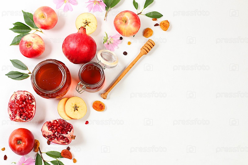Творческая композиция на еврейский праздник Рох Хашан с местом для поздравлений. стилирование традиционными символами Еврейского Нового года, шаблон с медом, яблоками, гранатом и цветами