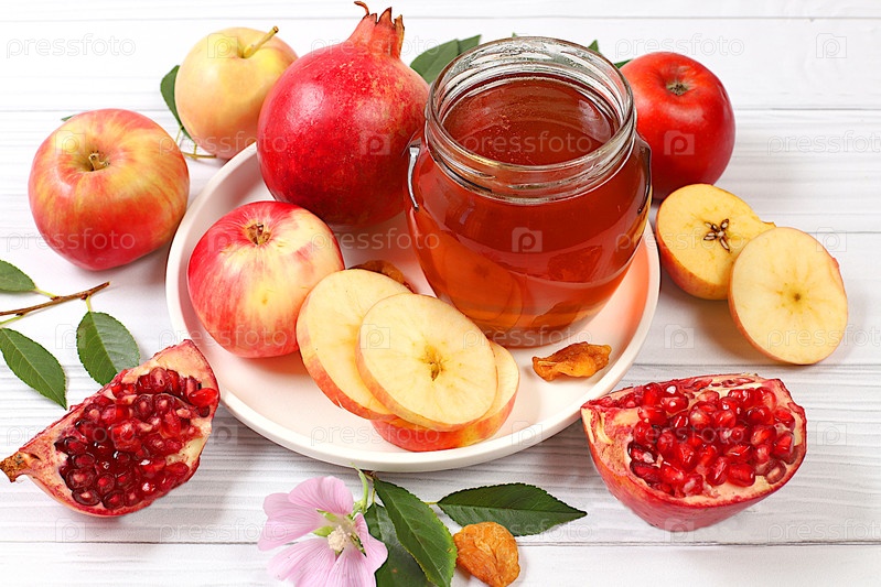 Творческая композиция на еврейский праздник Рох Хашан с местом для поздравлений. стилирование традиционными символами Еврейского Нового года, шаблон с медом, яблоками, гранатом и цветами