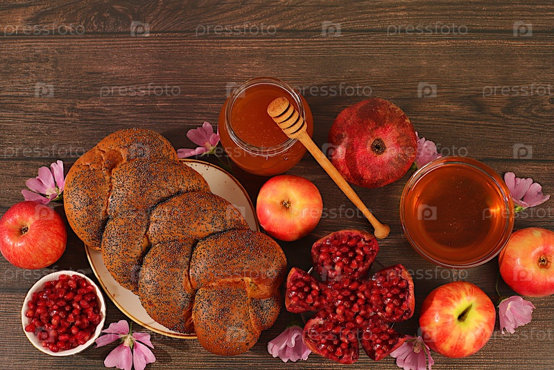 Творческая композиция для еврейского праздника Рох Хашан.Стиль с использованием традиционных символов Еврейского Нового года, шаблон с медом, яблоками, гранатом, цветами и хлебом халя на рождественскую открытку