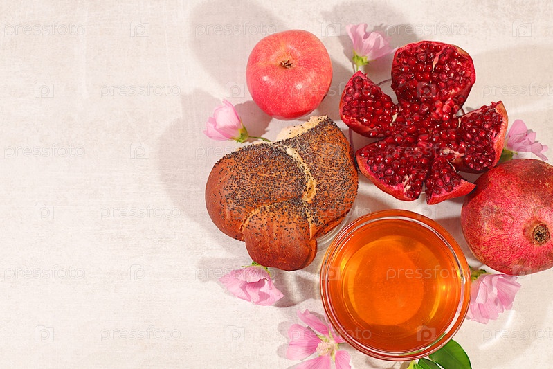 Творческая композиция на еврейский праздник Рох Хашан с местом для поздравлений. стилирование традиционными символами Еврейского Нового года, шаблон с медом, яблоками, гранатом и цветами