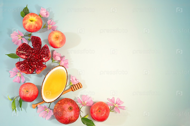Концепция еврейского праздника Рош-Хасана с яблоками, медом, гранатом и цветами для поздравительной открытки, творческий макет и шаблон для Еврейского Нового года и Дня благодарения, осенний баннер для дизайна