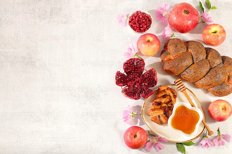 Концепция еврейского праздника Рош-Хасана с яблоками, медом, гранатом, хлебом халя и цветами для поздравительной открытки, творческий макет и шаблон для Еврейского Нового года и Дня благодарения, осенний баннер