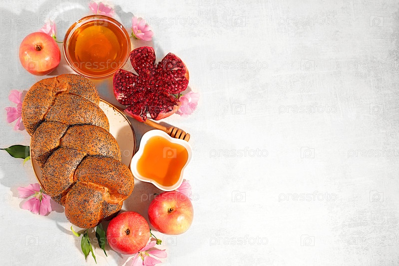 Творческая композиция для еврейского праздника Рох Хашан.Стиль с использованием традиционных символов Еврейского Нового года, шаблон с медом, яблоками, гранатом, цветами и хлебом халя на рождественскую открытку