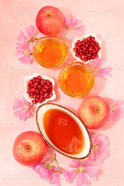 Творческая композиция на еврейский праздник Рох Хашан с местом для поздравлений. стилирование традиционными символами Еврейского Нового года, шаблон с медом, яблоками, гранатом и цветами