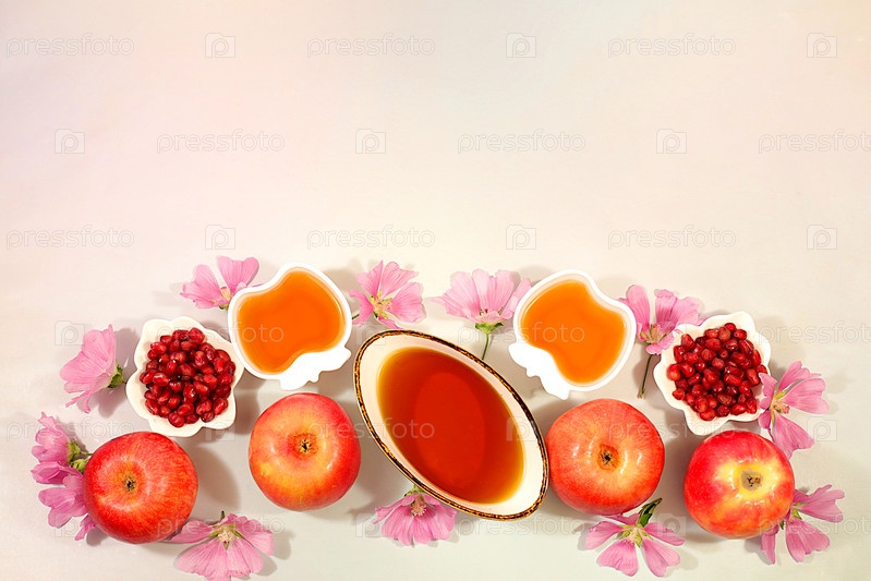 Творческая композиция на еврейский праздник Рох Хашан с местом для поздравлений. стилирование традиционными символами Еврейского Нового года, шаблон с медом, яблоками, гранатом и цветами