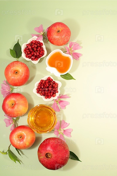 Рекламный баннер с символами еврейского Нового года, шаблон с медом, яблоками, гранатом, красным вином и цветами