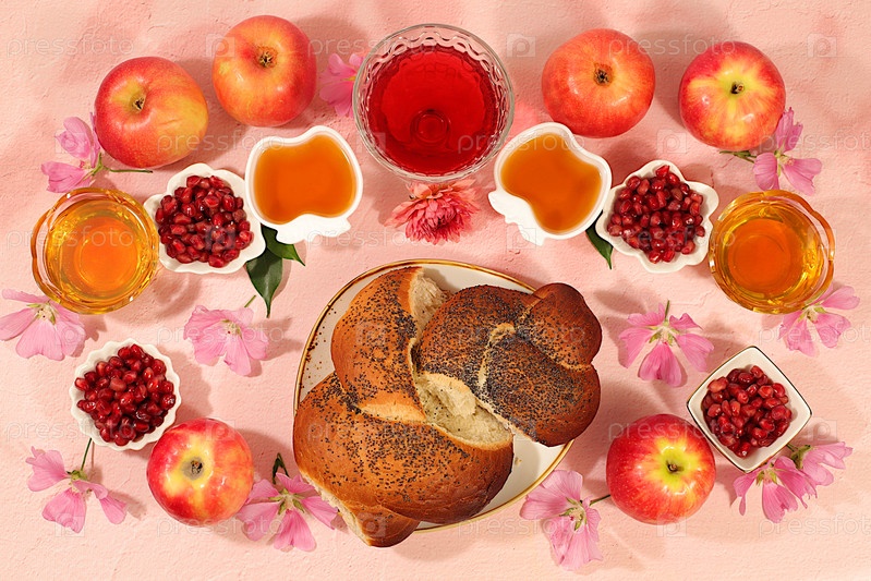 Концепция еврейского праздника Рош-Хашаны с яблоками, медом, гранатом, цветами, красным вином и хлебом Hull для поздравительной открытки, творческий макет и шаблон для Еврейского Нового года и Дня благодарения