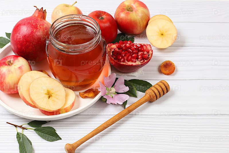 Творческая композиция на еврейский праздник Рох Хашан с местом для поздравлений. стилирование традиционными символами Еврейского Нового года, шаблон с медом, яблоками, гранатом и цветами