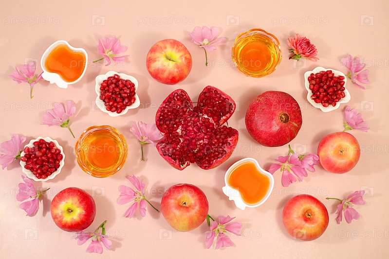 Творческая композиция на еврейский праздник Рох Хашан с местом для поздравлений. стилирование традиционными символами Еврейского Нового года, шаблон с медом, яблоками, гранатом и цветами
