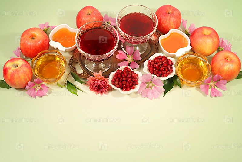 Рекламный баннер с символами еврейского Нового года, шаблон с медом, яблоками, гранатом, красным вином и цветами