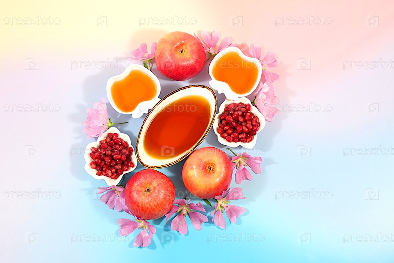 Рекламный баннер с символами еврейского Нового года, шаблон с медом, яблоками, гранатом, красным вином и цветами