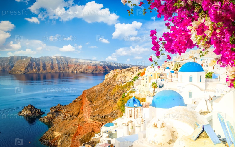 Знаменитые голубые купола и кальдера вулкана с морским пейзажем, красивые детали острова Санторини, Греция