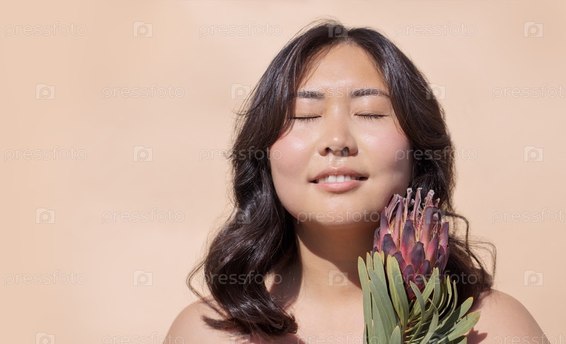 Азиатская женщина с закрытыми глазами держит яркий цветок протеи, показывая естественную красоту и спокойствие на мягком бежевом фоне, воплощая в себе спокойствие и связь с природой