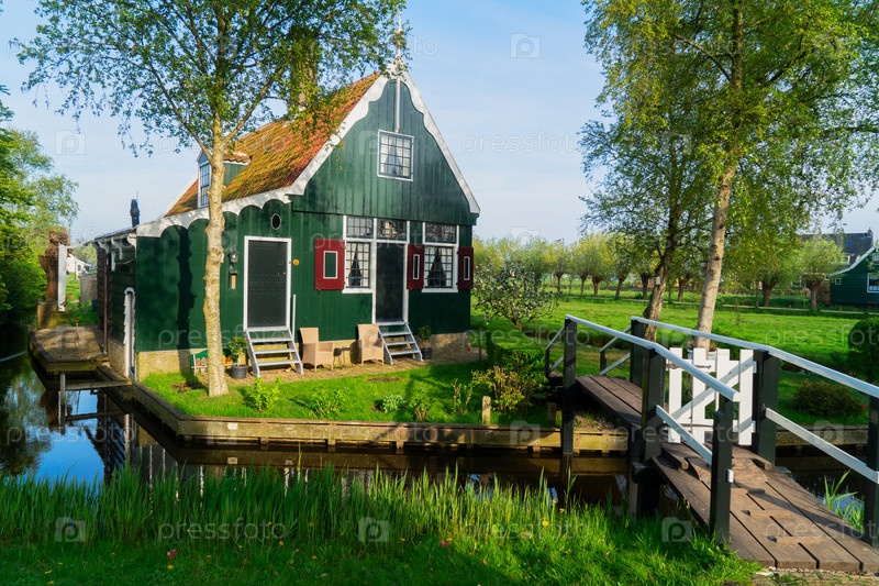 Сельские пейзажи голландских загородных домов в маленьком старом городе Заансе-Шанс, Нидерланды