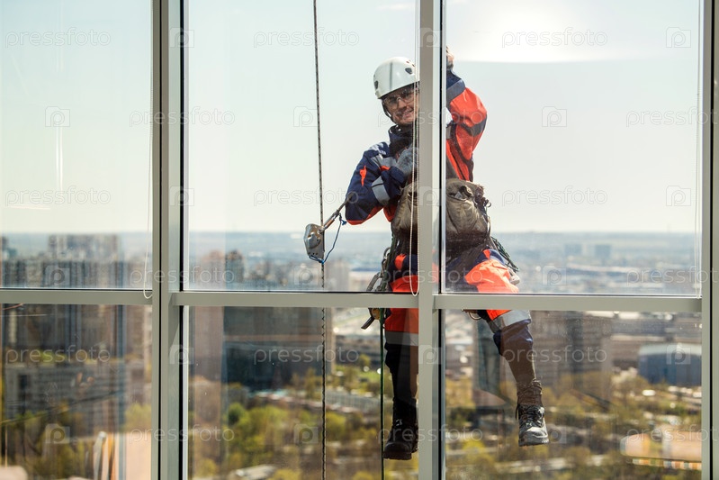 Промышленный альпинист или очиститель окон на веревке моет окна небоскреба.Концепция многоэтажных работ и технического обслуживания зданий