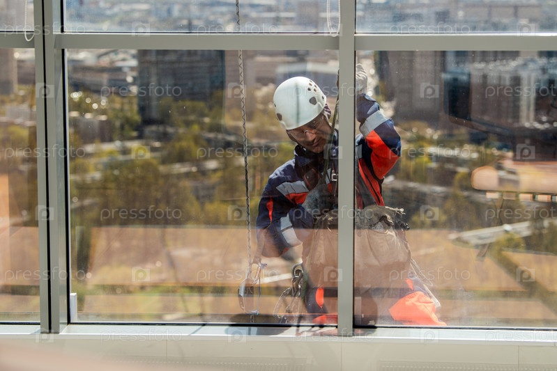 Промышленный альпинист или очиститель окон на веревке моет окна небоскреба.Концепция многоэтажных работ и технического обслуживания зданий