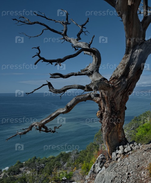 Огромный высохший тополь на крутом скалистом побережье Черного моря недалеко от города Судак