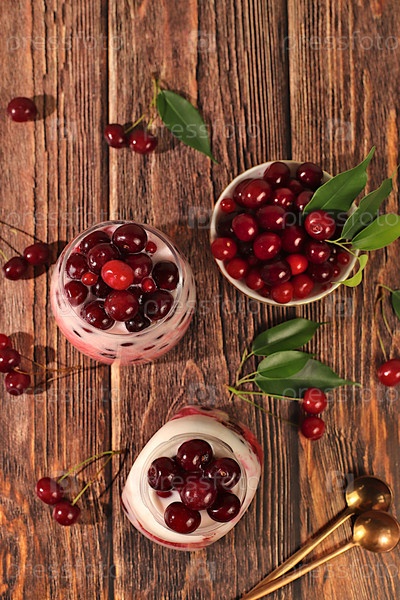 Вишневый йогурт с ягодами в стакане на элегантном столе, фруктовый салат, детоксикационная диета и концепция натурального питания, здоровый завтрак с ингредиентами. Реклама здорового образа жизни