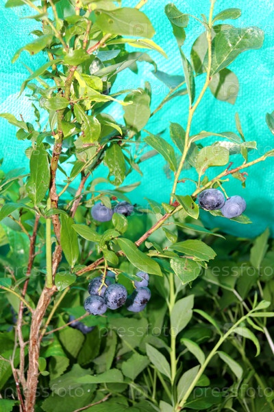Большие зрелые голубые ягоды черники на кусте под защитной сетью в саду