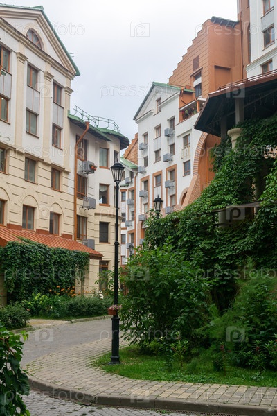 Вид на двор многоэтажного кондоминиума, беседка плюща в переднем плане