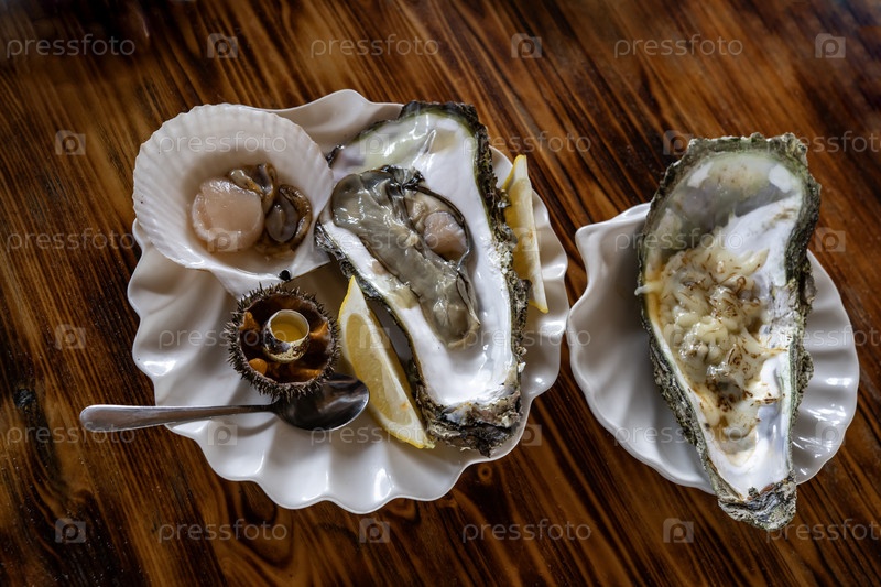 Морской език, устрицы, мискулка с лимоном на деревянном фоне