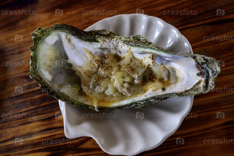 Устрица в белой тарелке на деревянном фоне