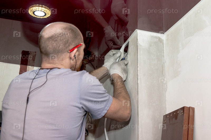 Работник устанавливает растяжной потолок