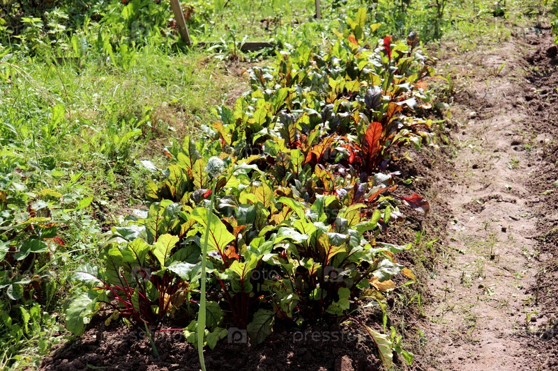 Выращивание свеклы на кровати в солнечный летний день в саду, topva