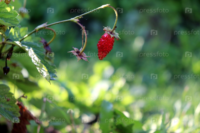 Зрелые лесные клубники на ветке в саду под полутенью
