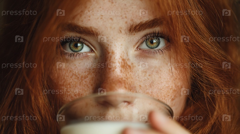 Рыжеволосая женщина с веснушками пьет молоко