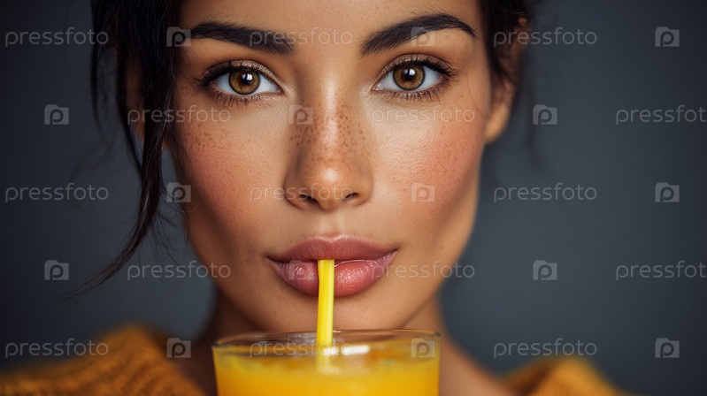 Женщина пьет сок соломы