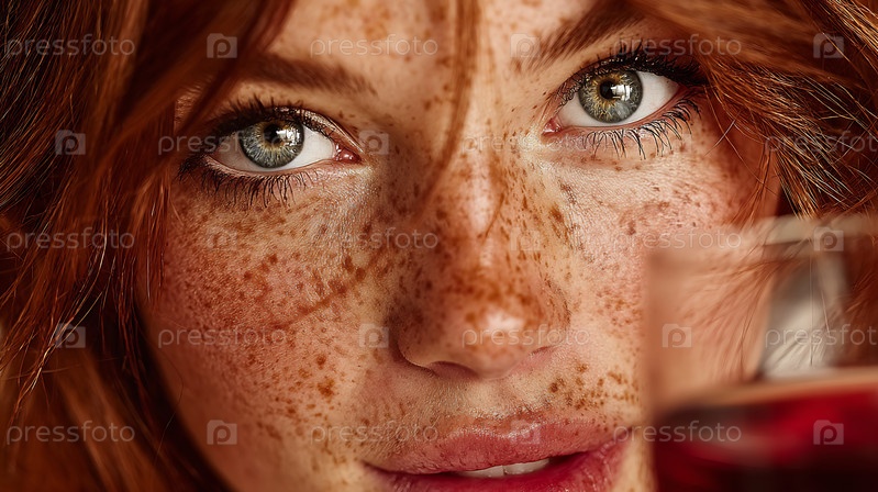 Красноволосая женщина с веснушками держит напиток