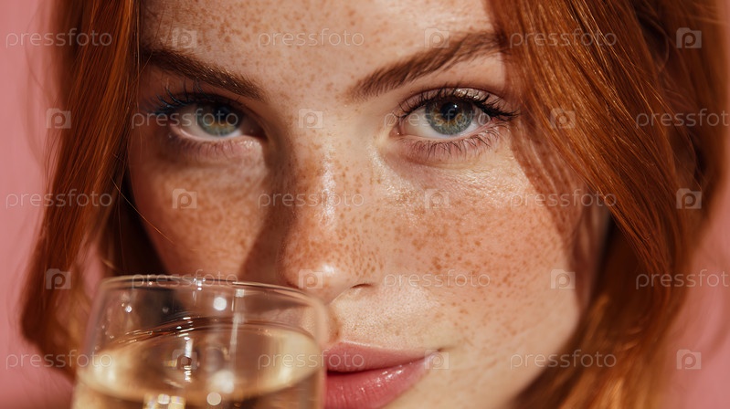 Женщина с веснушками, рыжеволосая и держащая стакан