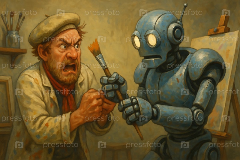 ИИ-робот берет щетку и работу художника. Художник злится, расстроен и напуган. Они находятся в домашней художественной студии