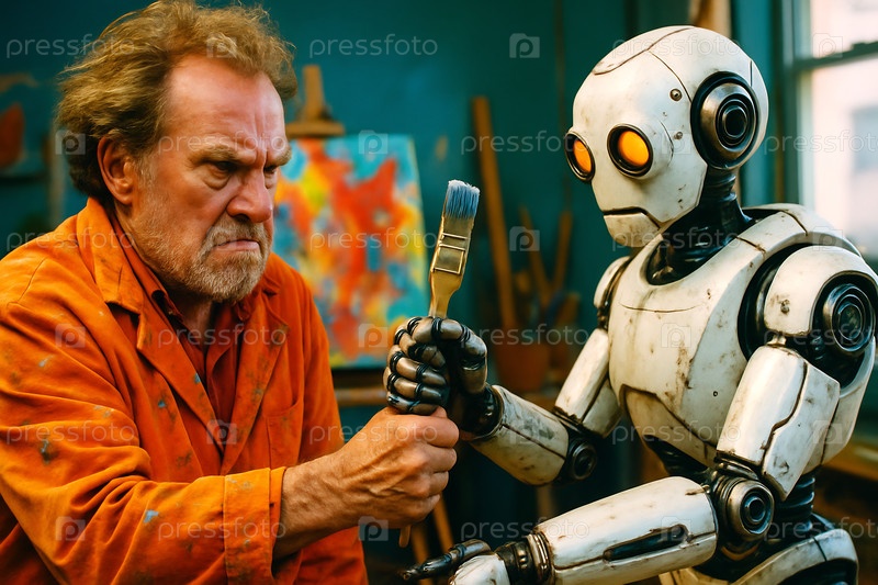 ИИ-робот берет щетку и работу художника. Художник злится, расстроен и напуган. Они находятся в домашней художественной студии