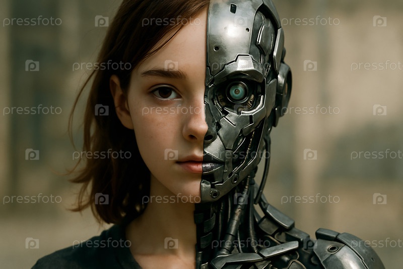 Красивая киборг-девушка наполовину человек, наполовину робот. женский андроид похож на человека. ее кожа выглядит как настоящая человеческая, но некоторые части её лица и тела металлические