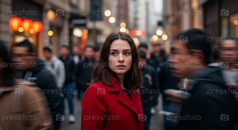 Вдумчивая женщина среди размытой городской толпы