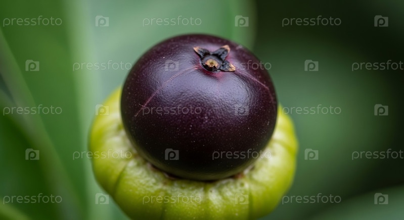 Макросъемка одного темно-фиолетового фрукта на зеленом растении с размытым фоном