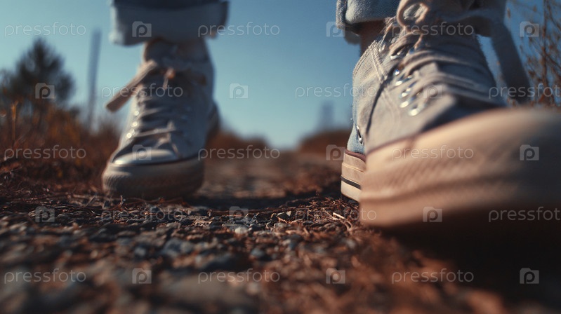 Низкий угол обзора человека, одетого в кроссовки на текстурированной наружной трассе