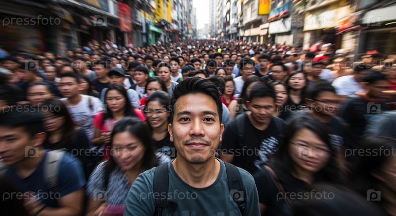 Улыбающийся человек в огромной городской толпе, на городской сцене