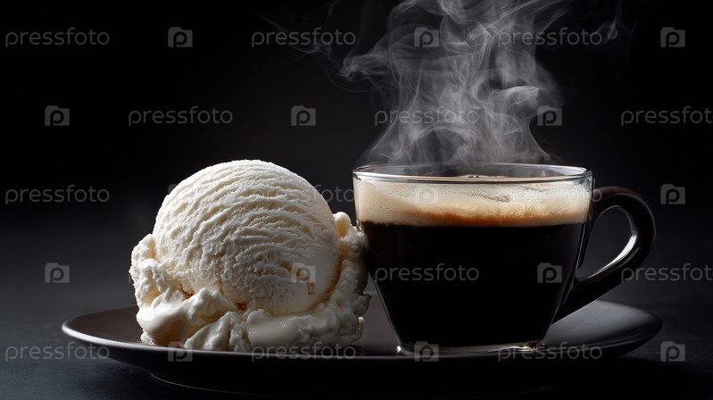 Чашка горячего кофе рядом с кремовым ванильным мороженым на темной тарелке
