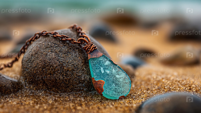 Красивый кусок украшений из стекла, ношенного в океане, медная цепь, пляжная обстановка