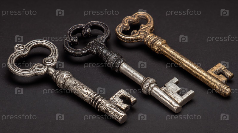 Три винтажных украшенного скелета ключи на темной поверхности, символизирующие доступ или секреты
