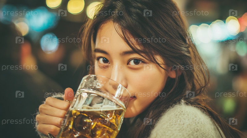 Улыбающаяся женщина наслаждается пивом в баре