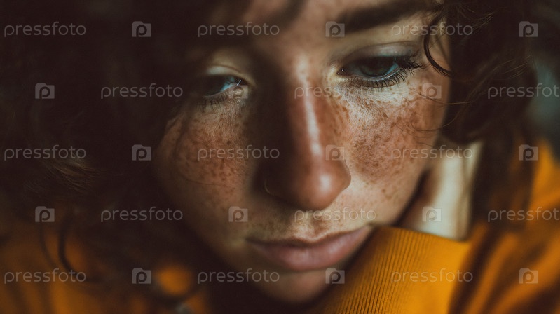 Портрет задумчивой молодой женщины с веснушками и кудрявыми волосами