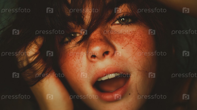 Портрет молодой женщины с веснушками, открытым ртом и выразительными глазами