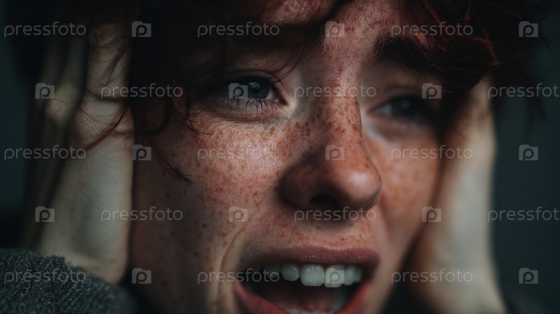 Покрывайте напряженную молодую женщину, кричащую с руками на голове