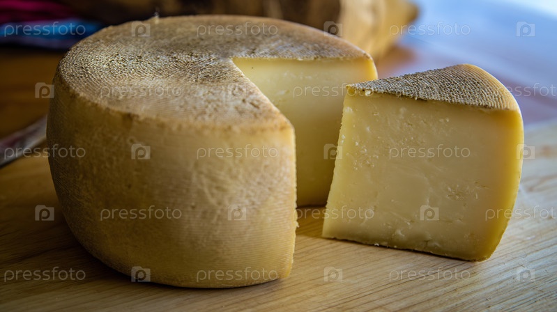 Закрытие сырного колеса с нарезанным кусочком, опирающимся на деревянную поверхность