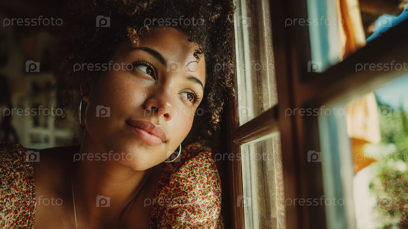 Вдумчивая молодая женщина смотрит в деревенское окно